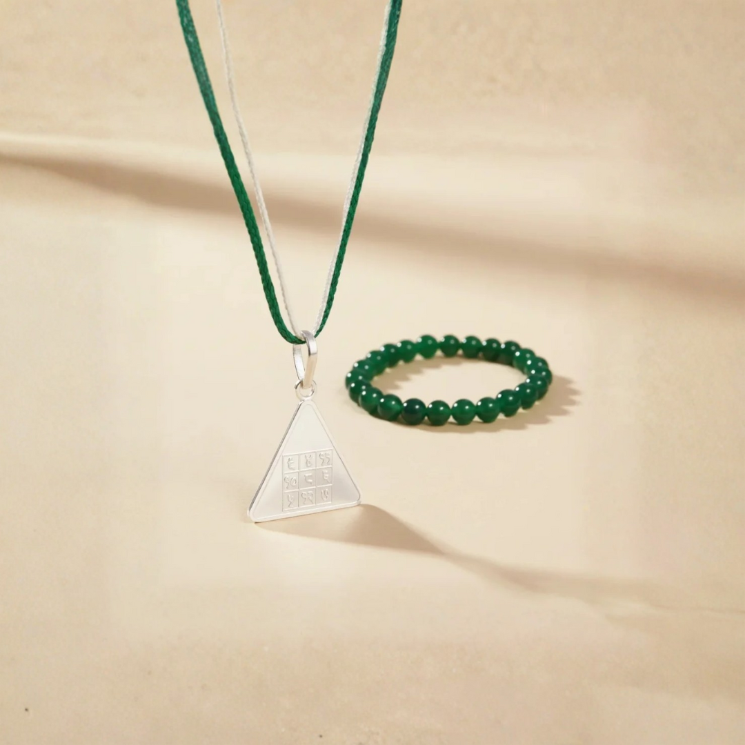 This powerful combo includes the Budh Pyra Yantra Silver Locket (7-8 grams of pure silver) and a Green Jade Bracelet. Together, they enhance intelligence, success, and emotional well-being.