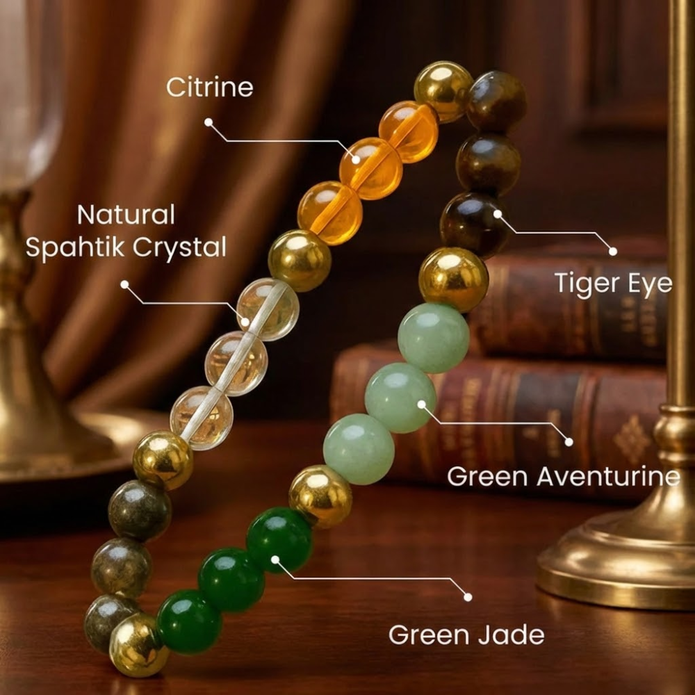 The Dhan Yog Bracelet features stones traditionally believed to attract money, financial stability, and good fortune. Wearing it helps channel positive financial energy, supporting you in manifesting your goals and improving your outlook toward business, career, and personal success. It encourages opportunities, growth, and abundance to flow more freely into your life.